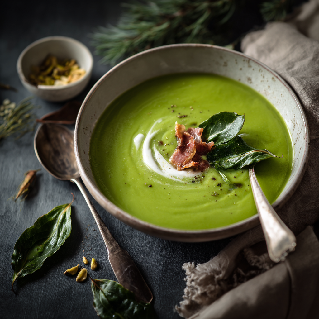 Potage Saint-Germain et petits lardons fumés